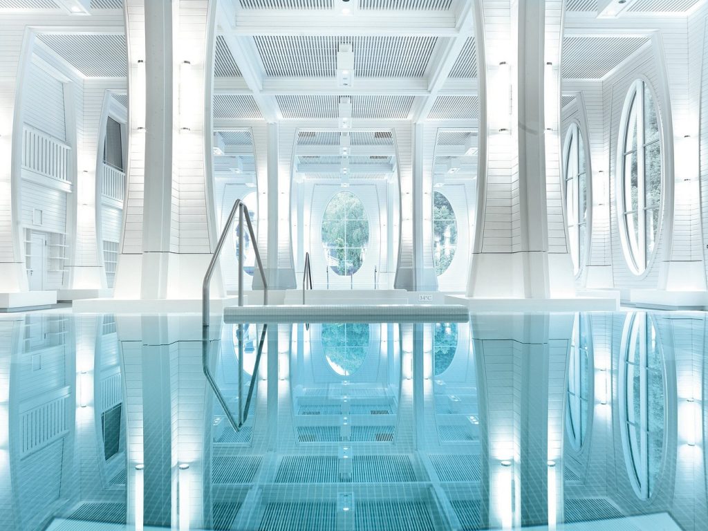 室內室外共7個不同之浴池組合,室內為數個不同大小及之溫度之浴池。全白色色調,極具後現代風格。高聳之樓底,配合大型橢圓形落地大玻璃窗透入充沛之日光,令你有像置身天堂之感,一脫歐式溫泉只是大泳池之觀感。